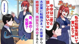 てんしょくTV【漫画】大企業に転職決まった後輩から絶縁宣言され「中卒は2度と話しかけないでw」と言われたが時が経ち商談先で再会すると後輩が怯えた様子で話しかけてきたのでお望み通り無視してみると…【恋愛マンガ動画】2026.03.26てんしょくTV